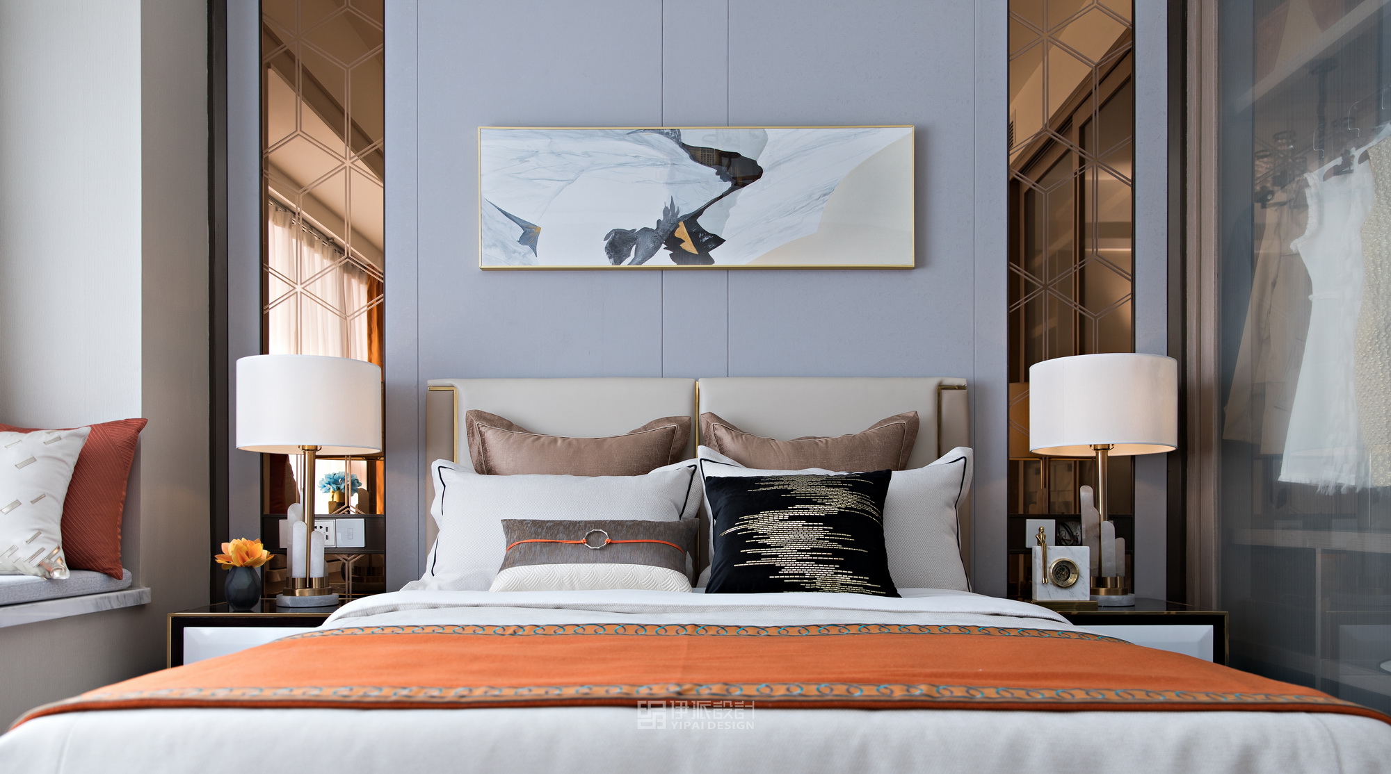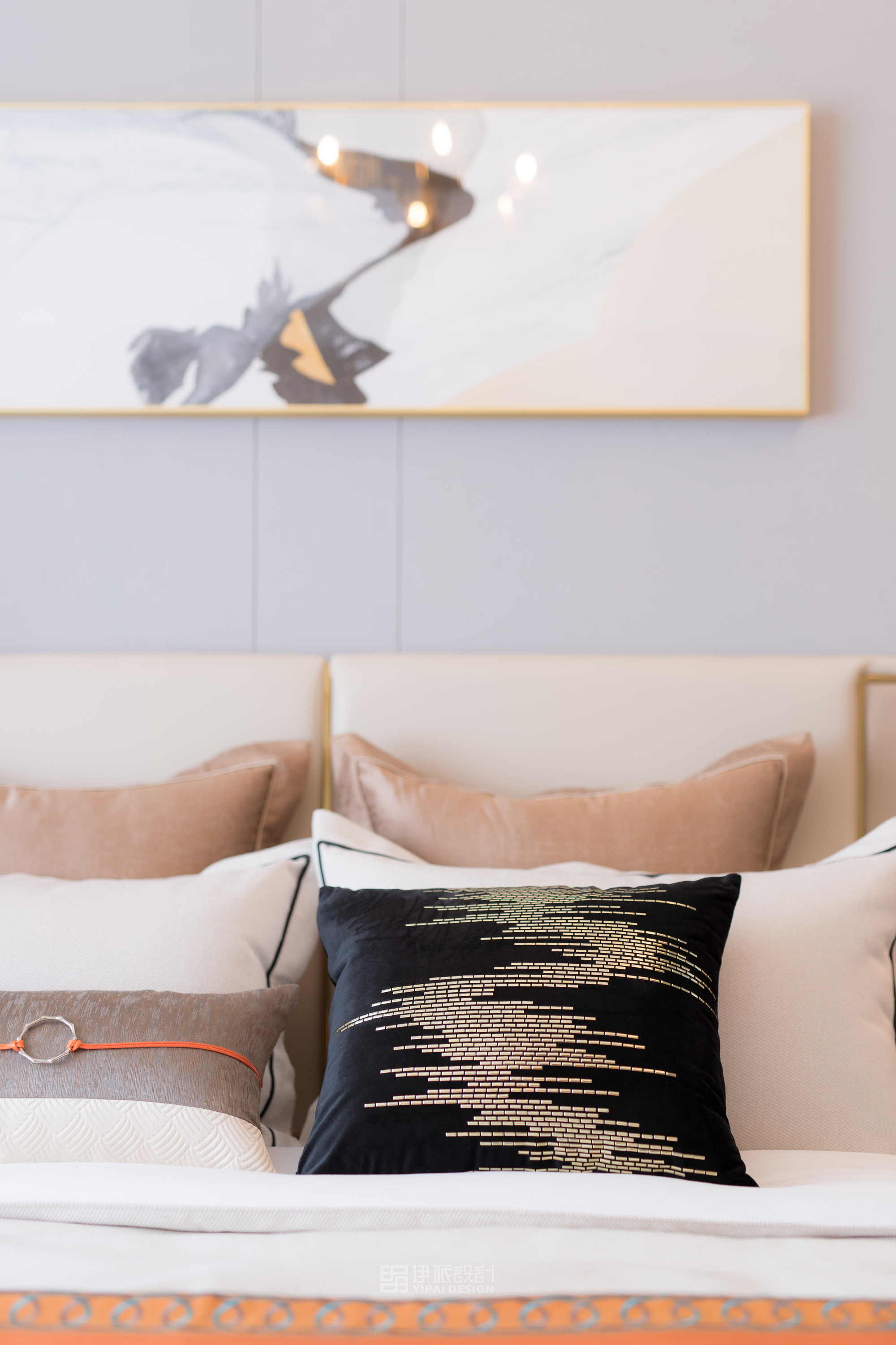 本案軟裝設計工程針對現(xiàn)代空間的美學思考,將上世紀的雕像與現(xiàn)代藝術,融合出獨具一格充滿西方氣息的藝術空間,神秘感縈繞其中,將“愛馬仕橙”作為設計核心,以港式輕奢的格調來定義空間的精神氣質,演繹品質高貴生活。